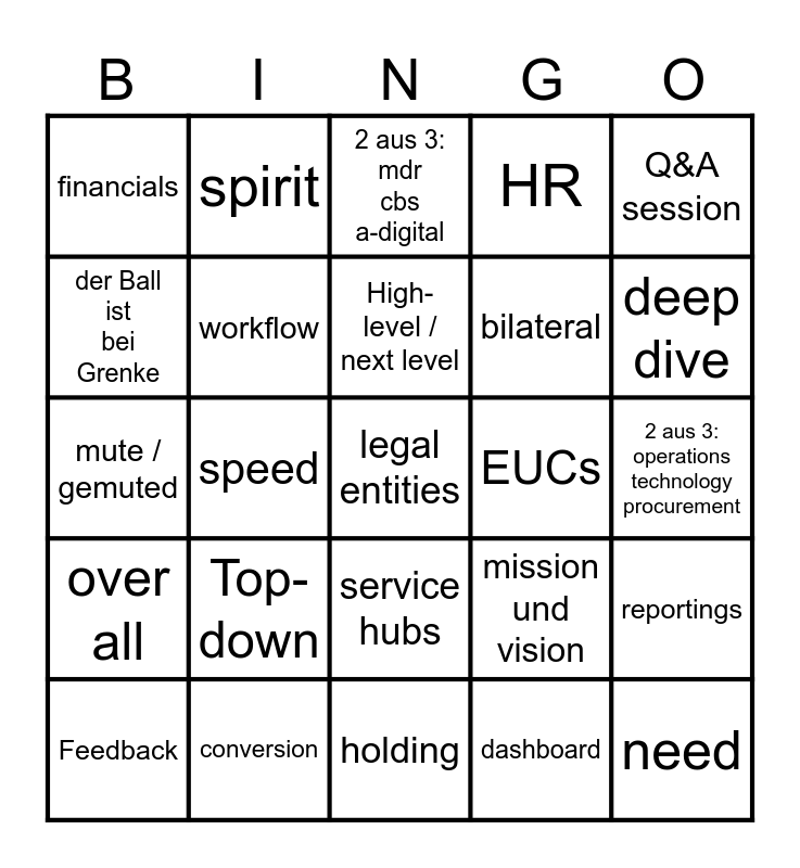 This bingo card has a free space and 24 words: Top-down, conversion, High-level / next level, Feedback, Q&A session, financials, der Ball ist bei Grenke, spirit, EUCs, service hubs, bilateral, mute / gemuted, mission und vision, reportings, workflow, dashboard, 2 aus 3: operations technology procurement, 2 aus 3: mdr cbs a-digital, deep dive, speed, need, over all, HR and holding.