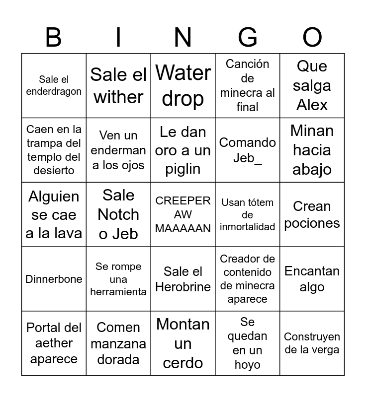 This bingo card has a free space and 24 words: Portal del aether aparece, Se rompe una herramienta, Le dan oro a un piglin, Se quedan en un hoyo, Que salga Alex, Sale el enderdragon, Sale el wither, Water drop, Usan tótem de inmortalidad, Crean pociones, Alguien se cae a la lava, Ven un enderman a los ojos, Creador de contenido de minecra aparece, Encantan algo, Caen en la trampa del templo del desierto, Comen manzana dorada, Montan un cerdo, Canción de minecra al final, Minan hacia abajo, Dinnerbone, Sale Notch o Jeb, Sale el Herobrine, Comando Jeb_ and Construyen de la verga.