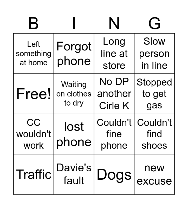 This bingo card has 16 words: Davie's fault, Couldn't find shoes, Long line at store, Left something at home, CC wouldn't work, Forgot phone, Couldn't fine phone, Dogs, Free!, Waiting on clothes to dry, Traffic, Slow person in line, lost phone, Stopped to get gas, No DP another Cirle K and new excuse.