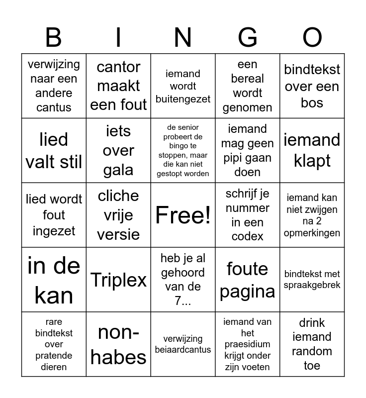 This bingo card has a free space and 24 words: Triplex, non-habes, de senior probeert de bingo te stoppen, maar die kan niet gestopt worden, rare bindtekst over pratende dieren, bindtekst over een bos, verwijzing naar een andere cantus, lied valt stil, cantor maakt een fout, schrijf je nummer in een codex, heb je al gehoord van de 7..., iemand mag geen pipi gaan doen, lied wordt fout ingezet, foute pagina, bindtekst met spraakgebrek, iets over gala, iemand van het praesidium krijgt onder zijn voeten, iemand kan niet zwijgen na 2 opmerkingen, iemand wordt buitengezet, iemand klapt, cliche vrije versie, drink iemand random toe, in de kan, een bereal wordt genomen and verwijzing beiaardcantus.