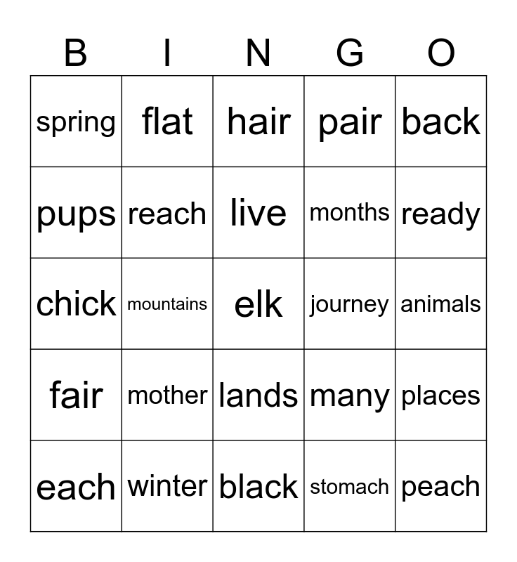 This bingo card has a free space and 24 words: each, mother, live, stomach, back, spring, flat, hair, journey, animals, chick, reach, many, places, pups, winter, black, pair, ready, fair, mountains, lands, months and peach.