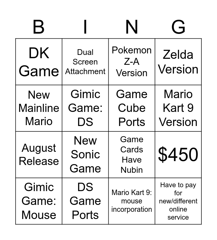 This bingo card has 16 words: DS Game Ports, $450, Pokemon Z-A Version, DK Game, August Release, Dual Screen Attachment, Game Cards Have Nubin, Mario Kart 9: mouse incorporation, New Mainline Mario, Gimic Game: DS, Gimic Game: Mouse, Zelda Version, New Sonic Game, Mario Kart 9 Version, Game Cube Ports and Have to pay for new/different online service.
