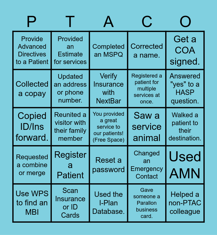 This bingo card has a free space and 24 words: Register a Patient, Scan Insurance or ID Cards, Verify Insurance with NextBar, Use WPS to find an MBI, Get a COA signed., Provide Advanced Directives to a Patient, Collected a copay, Provided an Estimate for services, Saw a service animal, Reset a password, Registered a patient for multiple services at once., Copied ID/Ins forward., Changed an Emergency Contact, Used AMN, Updated an address or phone number., Gave someone a Parallon business card., Walked a patient to their destination., Completed an MSPQ, Answered "yes" to a HASP question., Reunited a visitor with their family member, Helped a non-PTAC colleague, Requested a combine or merge, Corrected a name. and Used the I-Plan Database..