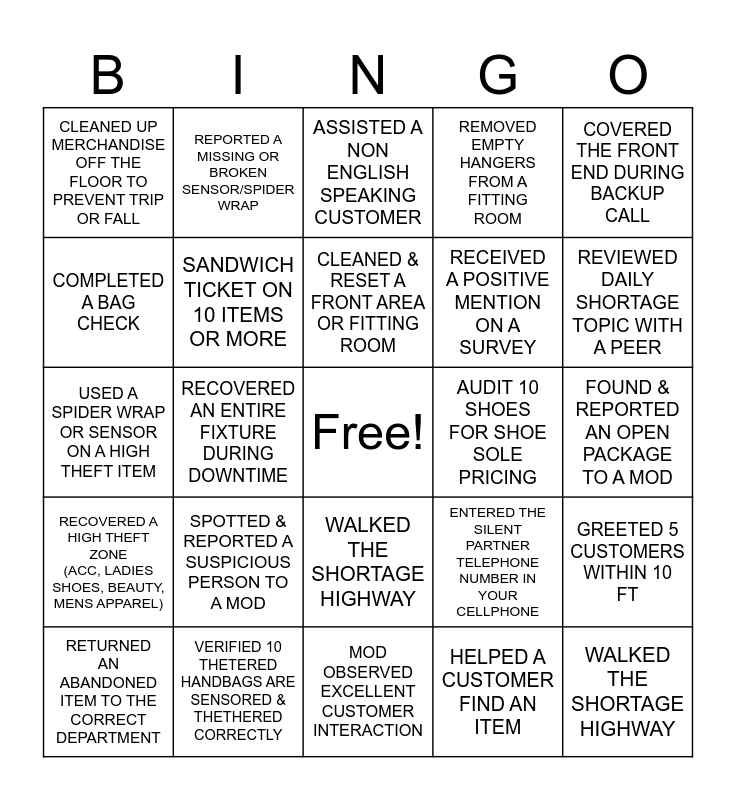 This bingo card has a free space and 24 words: SPOTTED & REPORTED A SUSPICIOUS PERSON TO A MOD, VERIFIED 10 THETERED HANDBAGS ARE SENSORED & THETHERED CORRECTLY, CLEANED & RESET A FRONT AREA OR FITTING ROOM, RETURNED AN ABANDONED ITEM TO THE CORRECT DEPARTMENT, COVERED THE FRONT END DURING BACKUP CALL, CLEANED UP MERCHANDISE OFF THE FLOOR TO PREVENT TRIP OR FALL, COMPLETED A BAG CHECK, REPORTED A MISSING OR BROKEN SENSOR/SPIDER WRAP, AUDIT 10 SHOES FOR SHOE SOLE PRICING, WALKED THE SHORTAGE HIGHWAY, RECEIVED A POSITIVE MENTION ON A SURVEY, USED A SPIDER WRAP OR SENSOR ON A HIGH THEFT ITEM, ENTERED THE SILENT PARTNER TELEPHONE NUMBER IN YOUR CELLPHONE, GREETED 5 CUSTOMERS WITHIN 10 FT, SANDWICH TICKET ON 10 ITEMS OR MORE, HELPED A CUSTOMER FIND AN ITEM, FOUND & REPORTED AN OPEN PACKAGE TO A MOD, ASSISTED A NON ENGLISH SPEAKING CUSTOMER, REVIEWED DAILY SHORTAGE TOPIC WITH A PEER, RECOVERED AN ENTIRE FIXTURE DURING DOWNTIME, WALKED THE SHORTAGE HIGHWAY, RECOVERED A HIGH THEFT ZONE (ACC, LADIES SHOES, BEAUTY, MENS APPAREL), REMOVED EMPTY HANGERS FROM A FITTING ROOM and MOD OBSERVED EXCELLENT CUSTOMER INTERACTION.
