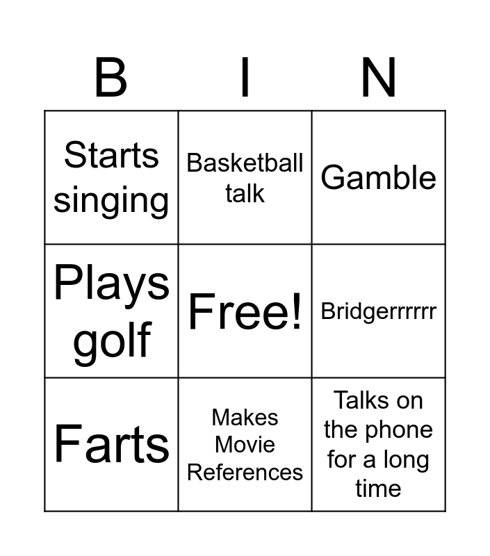 This bingo card has a free space and 8 words: Bridgerrrrrr, Gamble, Basketball talk, Farts, Starts singing, Talks on the phone for a long time, Plays golf and Makes Movie References.