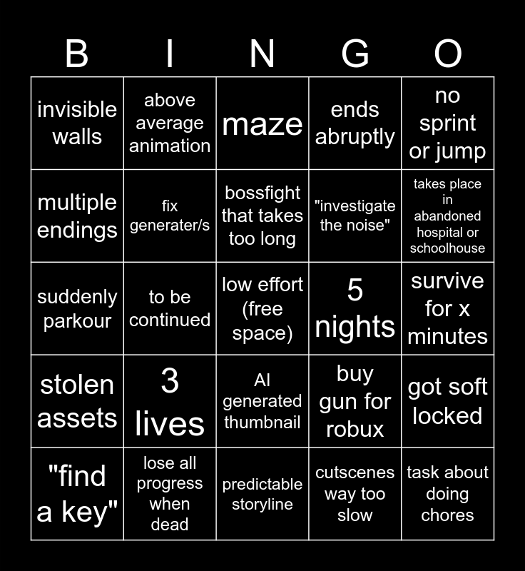 This bingo card has a free space and 39 words: disconnected, huggy wuggy looking monster, actually scary (rare), fix generater/s, "find a key", AI generated thumbnail, bossfight that takes too long, super slow walking speed, no sprint or jump, stolen assets, to be continued, ends abruptly, task about doing chores, survive for x minutes, 5 nights, 3 lives, broken cutscene, invisible walls, goofy monster, buy gun for robux, multiple endings, predictable storyline, "investigate the noise", takes place in abandoned hospital or schoolhouse, "add to favorites" pop up, too many pop ups, jumpscares are twice as loud as everything else, png jumpscare, loud player footsteps, above average animation, bad voice acting, tedious gameplay, maze, lose all progress when dead, cutscenes way too slow, broken enemy AI, got soft locked, suddenly parkour and too many puzzles.