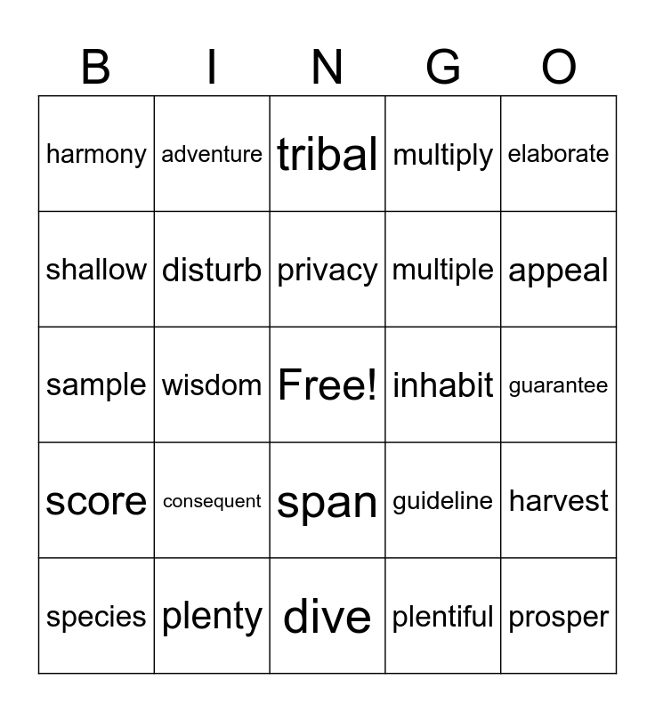 This bingo card has a free space and 24 words: consequent, plenty, privacy, species, elaborate, harmony, shallow, adventure, inhabit, span, multiple, sample, guideline, harvest, disturb, plentiful, guarantee, tribal, appeal, wisdom, prosper, score, multiply and dive.