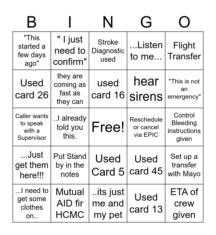 This bingo card has a free space and 44 words: Where is the Ambulance coming from..., ETA of crew given, Urgent Disconnect, ...I need to get some clothes on.., Breathing Verification too used, Used card 13, Stroke Diagnostic used, Used Card 8, Flight Transfer, Mutual AID fir HCMC, ...Listen to me..., Reschedule or cancel via EPIC, Used Card 5, Put Stand by in the notes, Update call notes, ..its just me and my pet, Code 3 transfer via phone or Epic, Caller wants to speak with a Supervisor, PSAP drops a call on you, "This is not an emergency", " I just need to confirm", NICU Transfer, Used Card 47, "This started a few days ago", CPR Instructions given, Control Bleeding instructions given, Caller can't get the door open, Pre-Arrival lasting more than 5 min, Used card 45, ...Just get them here!!!, Used Card 37, Set up a transfer with Mayo, Caller wants no Sirens, caller puts you on hold, ..I already told you this., Out of Area Pre-Arrival, Update Address, used card 29, used card 16, Used card 26, hear sirens, fallen and unable to get up, they are coming as fast as they can and gave the missing items phone number.