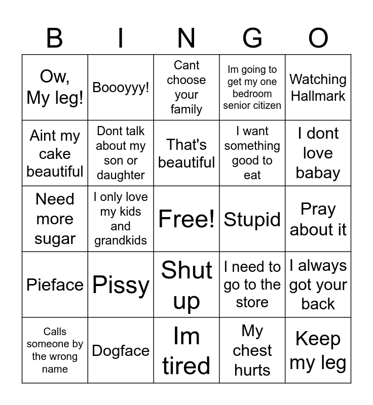 This bingo card has a free space and 24 words: Pissy, Dogface, That's beautiful, Calls someone by the wrong name, Watching Hallmark, Ow, My leg!, Aint my cake beautiful, Boooyyy!, Stupid, Shut up, I want something good to eat, Need more sugar, I need to go to the store, I always got your back, Dont talk about my son or daughter, My chest hurts, Pray about it, Cant choose your family, I dont love babay, I only love my kids and grandkids, Keep my leg, Pieface, Im going to get my one bedroom senior citizen and Im tired.