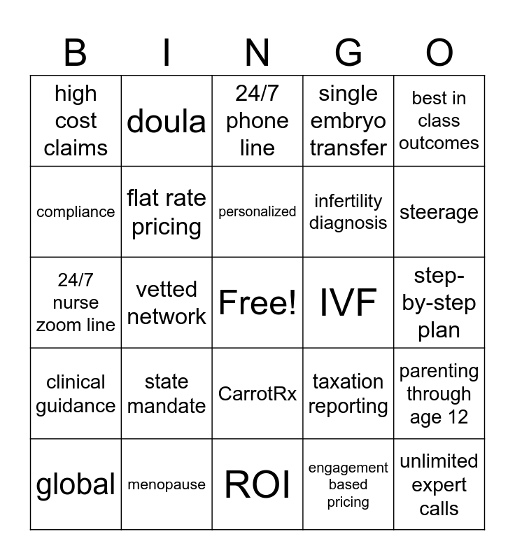 This bingo card has a free space and 24 words: state mandate, menopause, personalized, global, best in class outcomes, high cost claims, compliance, doula, IVF, CarrotRx, infertility diagnosis, 24/7 nurse zoom line, taxation reporting, parenting through age 12, flat rate pricing, engagement based pricing, step-by-step plan, 24/7 phone line, steerage, vetted network, unlimited expert calls, clinical guidance, single embryo transfer and ROI.