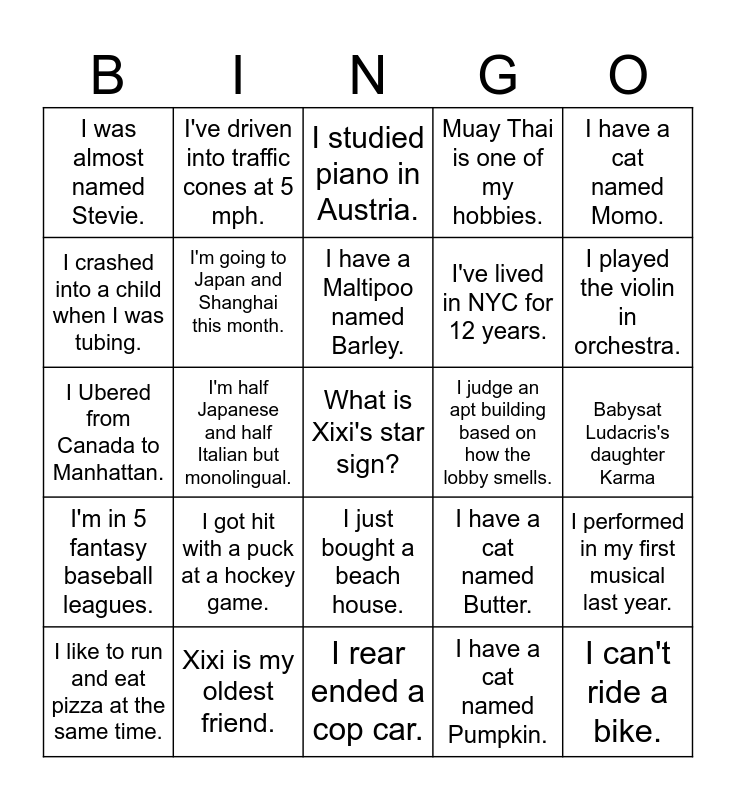 This bingo card has a free space and 24 words: I like to run and eat pizza at the same time., I got hit with a puck at a hockey game., I have a Maltipoo named Barley., I have a cat named Pumpkin., I have a cat named Momo., I was almost named Stevie., I've driven into traffic cones at 5 mph., I studied piano in Austria., I judge an apt building based on how the lobby smells., Babysat Ludacris's daughter Karma, I Ubered from Canada to Manhattan., I'm going to Japan and Shanghai this month., I have a cat named Butter., I performed in my first musical last year., I crashed into a child when I was tubing., Xixi is my oldest friend., I rear ended a cop car., Muay Thai is one of my hobbies., I played the violin in orchestra., I'm in 5 fantasy baseball leagues., I'm half Japanese and half Italian but monolingual., I just bought a beach house., I've lived in NYC for 12 years. and I can't ride a bike..