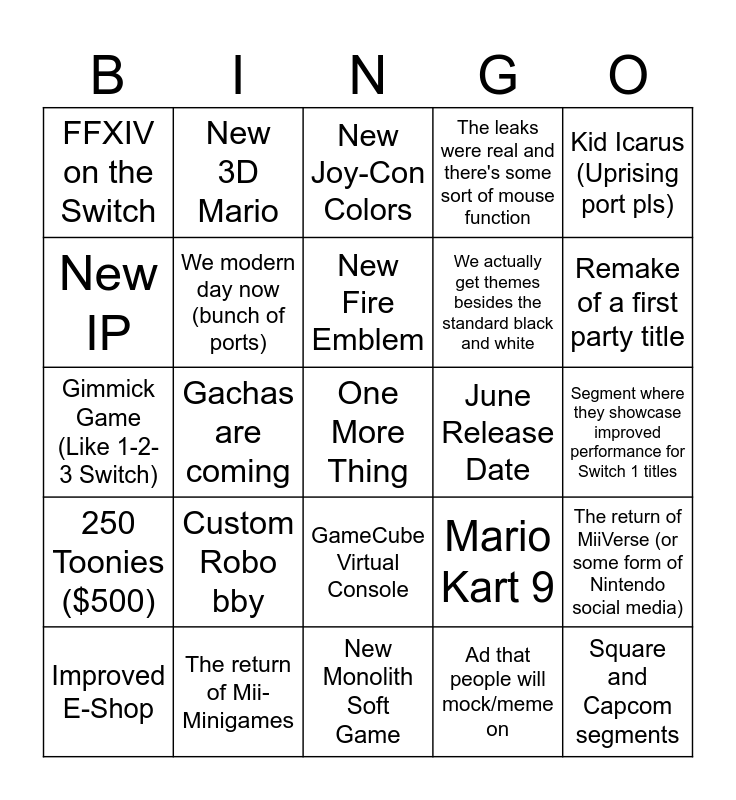 This bingo card has a free space and 24 words: Custom Robo bby, The return of Mii-Minigames, New Fire Emblem, Improved E-Shop, Kid Icarus (Uprising port pls), FFXIV on the Switch, New IP, New 3D Mario, June Release Date, GameCube Virtual Console, We actually get themes besides the standard black and white, Gimmick Game (Like 1-2-3 Switch), Mario Kart 9, The return of MiiVerse (or some form of Nintendo social media), We modern day now (bunch of ports), Ad that people will mock/meme on, Segment where they showcase improved performance for Switch 1 titles, New Joy-Con Colors, Remake of a first party title, Gachas are coming, Square and Capcom segments, 250 Toonies ($500), The leaks were real and there's some sort of mouse function and New Monolith Soft Game.