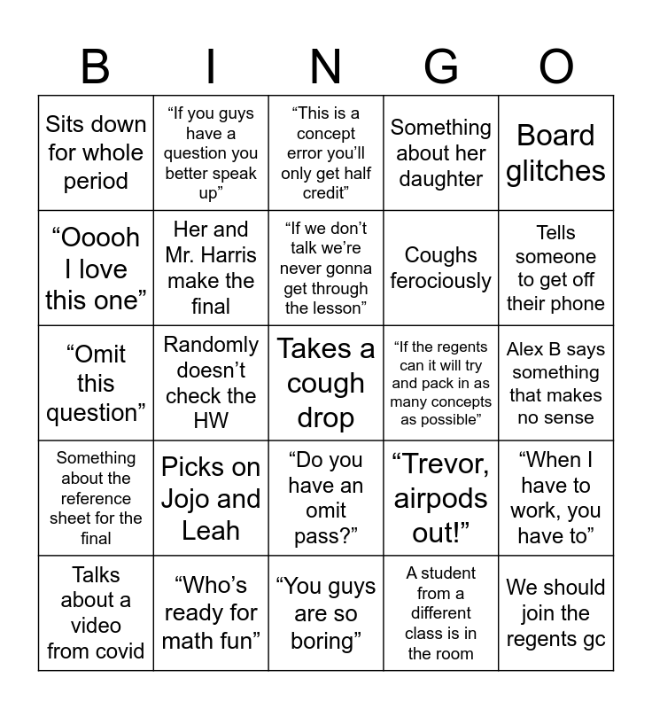 This bingo card has a free space and 24 words: Picks on Jojo and Leah, “Who’s ready for math fun”, “If we don’t talk we’re never gonna get through the lesson”, Talks about a video from covid, Board glitches, Sits down for whole period, “Ooooh I love this one”, “If you guys have a question you better speak up”, “If the regents can it will try and pack in as many concepts as possible”, “Do you have an omit pass?”, Coughs ferociously, “Omit this question”, “Trevor, airpods out!”, “When I have to work, you have to”, Her and Mr. Harris make the final, A student from a different class is in the room, Alex B says something that makes no sense, “This is a concept error you’ll only get half credit”, Tells someone to get off their phone, Randomly doesn’t check the HW, We should join the regents gc, Something about the reference sheet for the final, Something about her daughter and “You guys are so boring”.
