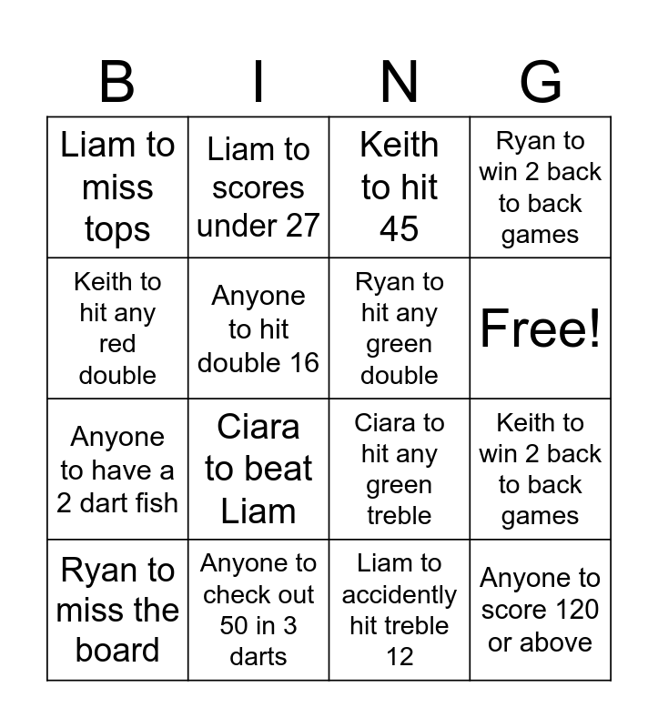 This bingo card has 17 words: Liam to accidently hit treble 12, Ryan to miss the board, Keith to hit 45, Liam to miss tops, Ciara to beat Liam, Ryan to win 2 back to back games, Keith to win 2 back to back games, Ryan to hit any green double, Free!, Anyone to hit double 16, Anyone to check out 50 in 3 darts, Ciara to hit any green treble, Keith to hit any red double, Liam to scores under 27, Anyone to have a 2 dart fish, Ciara to win 2 back to back games and Anyone to score 120 or above.