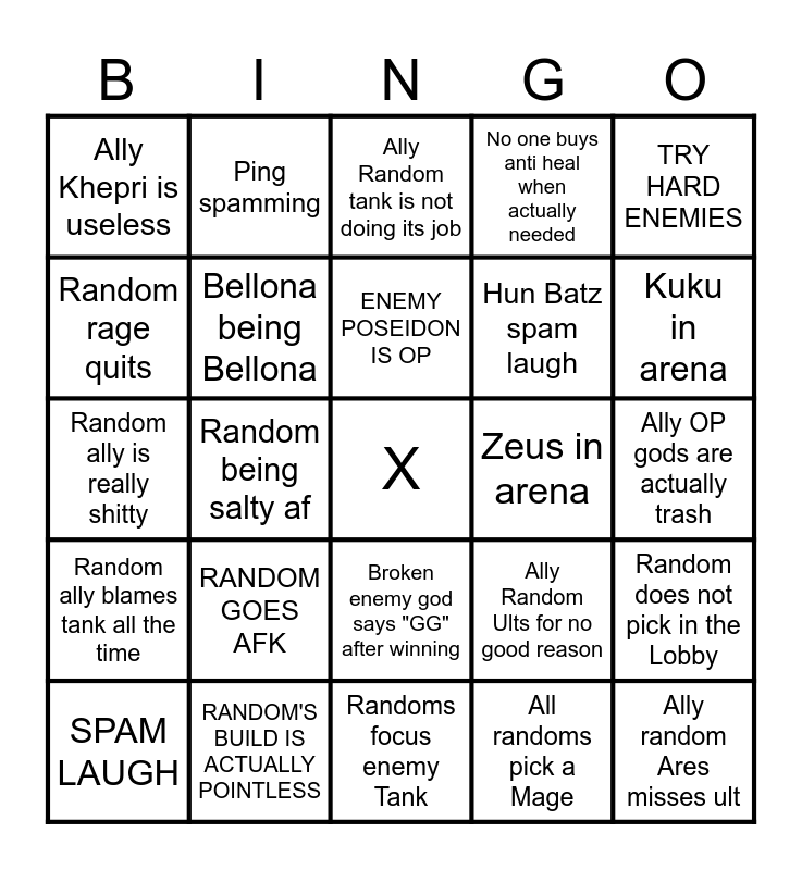 This bingo card has a free space and 24 words: RANDOM GOES AFK, RANDOM'S BUILD IS ACTUALLY POINTLESS, ENEMY POSEIDON IS OP, SPAM LAUGH, TRY HARD ENEMIES, Ally Khepri is useless, Random rage quits, Ping spamming, Zeus in arena, Broken enemy god says "GG" after winning, Hun Batz spam laugh, Random ally is really shitty, Ally Random Ults for no good reason, Random does not pick in the Lobby, Bellona being Bellona, All randoms pick a Mage, Ally OP gods are actually trash, Ally Random tank is not doing its job, Kuku in arena, Random being salty af, Ally random Ares misses ult, Random ally blames tank all the time, No one buys anti heal when actually needed and Randoms focus enemy Tank.