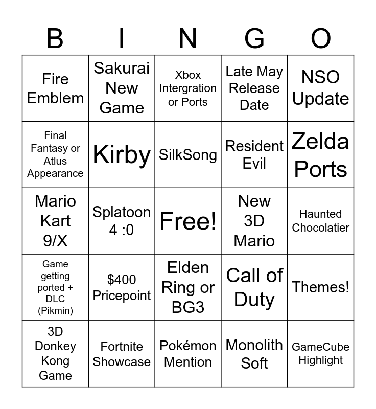 This bingo card has a free space and 24 words: $400 Pricepoint, Fortnite Showcase, SilkSong, 3D Donkey Kong Game, NSO Update, Fire Emblem, Final Fantasy or Atlus Appearance, Sakurai New Game, New 3D Mario, Elden Ring or BG3, Resident Evil, Mario Kart 9/X, Call of Duty, Themes!, Kirby, Monolith Soft, Haunted Chocolatier, Xbox Intergration or Ports, Zelda Ports, Splatoon 4 :0, GameCube Highlight, Game getting ported + DLC (Pikmin), Late May Release Date and Pokémon Mention.