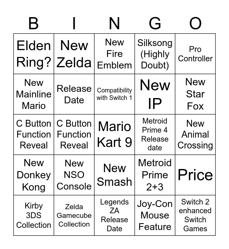 This bingo card has a free space and 24 words: New NSO Console, Zelda Gamecube Collection, Compatibility with Switch 1, Kirby 3DS Collection, Pro Controller, Elden Ring?, New Mainline Mario, New Zelda, Metroid Prime 4 Release date, New Smash, New IP, C Button Function Reveal, Metroid Prime 2+3, Price, Release Date, Joy-Con Mouse Feature, New Animal Crossing, New Fire Emblem, New Star Fox, C Button Function Reveal, Switch 2 enhanced Switch Games, New Donkey Kong, Silksong (Highly Doubt) and Legends ZA Release Date.