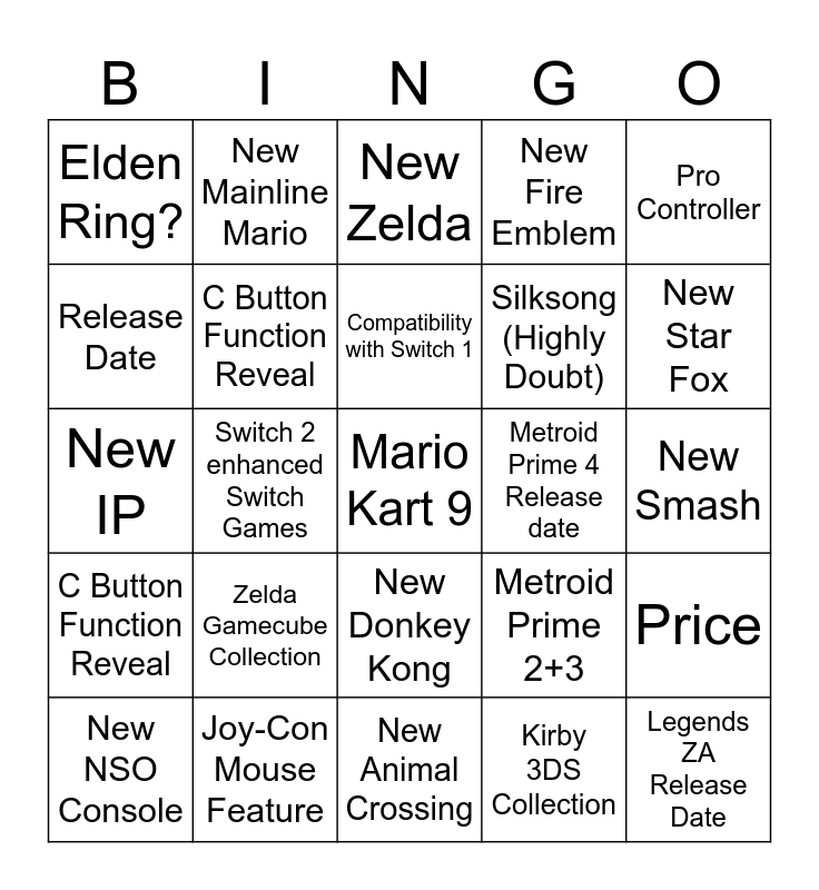 This bingo card has a free space and 24 words: New NSO Console, Zelda Gamecube Collection, Compatibility with Switch 1, Kirby 3DS Collection, Pro Controller, Elden Ring?, New Mainline Mario, New Zelda, Metroid Prime 4 Release date, New Smash, New IP, C Button Function Reveal, Metroid Prime 2+3, Price, Release Date, Joy-Con Mouse Feature, New Animal Crossing, New Fire Emblem, New Star Fox, C Button Function Reveal, Switch 2 enhanced Switch Games, New Donkey Kong, Silksong (Highly Doubt) and Legends ZA Release Date.