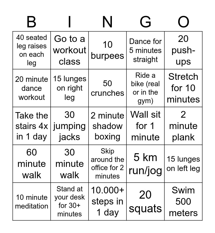 This bingo card has a free space and 24 words: 30 minute walk, Stand at your desk for 30+ minutes, 50 crunches, 10 minute meditation, 20 push-ups, 40 seated leg raises on each leg, 20 minute dance workout, Go to a workout class, Wall sit for 1 minute, Skip around the office for 2 minutes, Ride a bike (real or in the gym), Take the stairs 4x in 1 day, 5 km run/jog, 15 lunges on left leg, 15 lunges on right leg, 20 squats, 2 minute plank, 10 burpees, Stretch for 10 minutes, 30 jumping jacks, Swim 500 meters, 60 minute walk, Dance for 5 minutes straight and 10.000+ steps in 1 day.