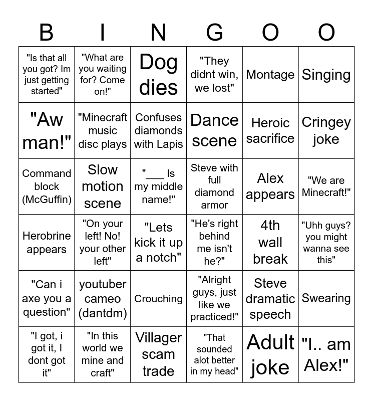 This bingo card has 36 words: Herobrine appears, "On your left! No! your other left", Villager scam trade, Dance scene, Alex appears, "We are Minecraft!", "Is that all you got? Im just getting started", "In this world we mine and craft", Dog dies, "Alright guys, just like we practiced!", Heroic sacrifice, Singing, "Can i axe you a question", Slow motion scene, Confuses diamonds with Lapis, "They didnt win, we lost", Steve dramatic speech, "Uhh guys? you might wanna see this", "Aw man!", "Minecraft music disc plays, "Lets kick it up a notch", "He's right behind me isn't he?", 4th wall break, Swearing, Command block (McGuffin), "What are you waiting for? Come on!", "___ Is my middle name!", "That sounded alot better in my head", Montage, Cringey joke, "I got, i got it, I dont got it", youtuber cameo (dantdm), Crouching, Steve with full diamond armor, Adult joke and "I.. am Alex!".