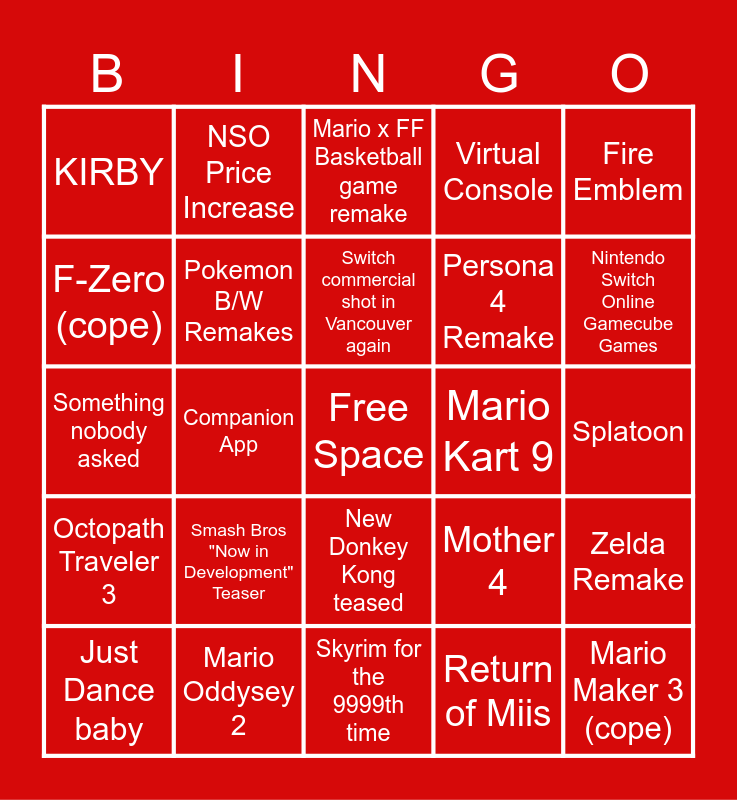 This bingo card has a free space and 24 words: Smash Bros "Now in Development" Teaser, Mario Oddysey 2, Switch commercial shot in Vancouver again, Just Dance baby, Fire Emblem, KIRBY, F-Zero (cope), NSO Price Increase, Mario Kart 9, New Donkey Kong teased, Persona 4 Remake, Something nobody asked, Mother 4, Zelda Remake, Pokemon B/W Remakes, Return of Miis, Splatoon, Mario x FF Basketball game remake, Nintendo Switch Online Gamecube Games, Companion App, Mario Maker 3 (cope), Octopath Traveler 3, Virtual Console and Skyrim for the 9999th time.