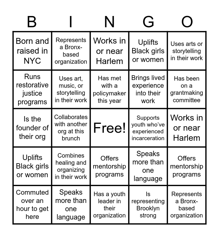 This bingo card has a free space and 43 words: Has been on a grantmaking committee, Represents a Bronx-based organization, Came from Staten Island today, Commuted over an hour to get here, Born and raised in NYC, Is representing Brooklyn strong, Works in or near Harlem, Works in a coalition or alliance, Uses arts or storytelling in their work, Speaks more than one language, Uplifts Black girls or women, Supports youth who’ve experienced incarceration, Offers mentorship programs, Combines healing and organizing in their work, Collaborates with another org at this brunch, Has a youth leader in their organization, Works with a team of under 5 staff, Is the founder of their org, Has met with a policymaker this year, Has been on a grantmaking committee, Represents a Bronx-based organization, Came from Staten Island today, Commuted over an hour to get here, Born and raised in NYC, Is representing Brooklyn strong, Works in or near Harlem, Works in a coalition or alliance, Uses arts or storytelling in their work, Speaks more than one language, Uplifts Black girls or women, Supports youth who’ve experienced incarceration, Offers mentorship programs, Combines healing and organizing in their work, Collaborates with another org at this brunch, Has a youth leader in their organization, Works with a team of under 5 staff, Is the founder of their org, Has met with a policymaker this year, Runs restorative justice programs, Brings lived experience into their work, Took the subway to get here today, Uses art, music, or storytelling in their work and Has led a community event this year.