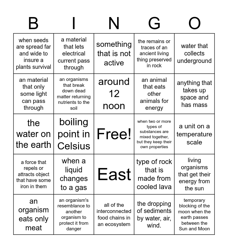 This bingo card has a free space and 24 words: when a liquid changes to a gas, an organism's resemblance to another organism to protect it from danger, around 12 noon, an organism eats only meat, water that collects underground, when seeds are spread far and wide to insure a plants survival, an material that only some light can pass through, a material that lets electrical current pass through, when two or more types of substances are mixed together, but they keep their own properties, East, an animal that eats other animals for energy, the water on the earth, type of rock that is made from cooled lava, living organisms that get their energy from the sun, an organisms that break down dead matter returning nutrients to the soil, the dropping of sediments by water, air, wind., a unit on a temperature scale, something that is not active, anything that takes up space and has mass, boiling point in Celsius, temporary blocking of the moon when the earth passes between the Sun and Moon, a force that repels or attracts object that have some iron in them, the remains or traces of an ancient living thing preserved in rock and all of the interconnected food chains in an ecosystem.