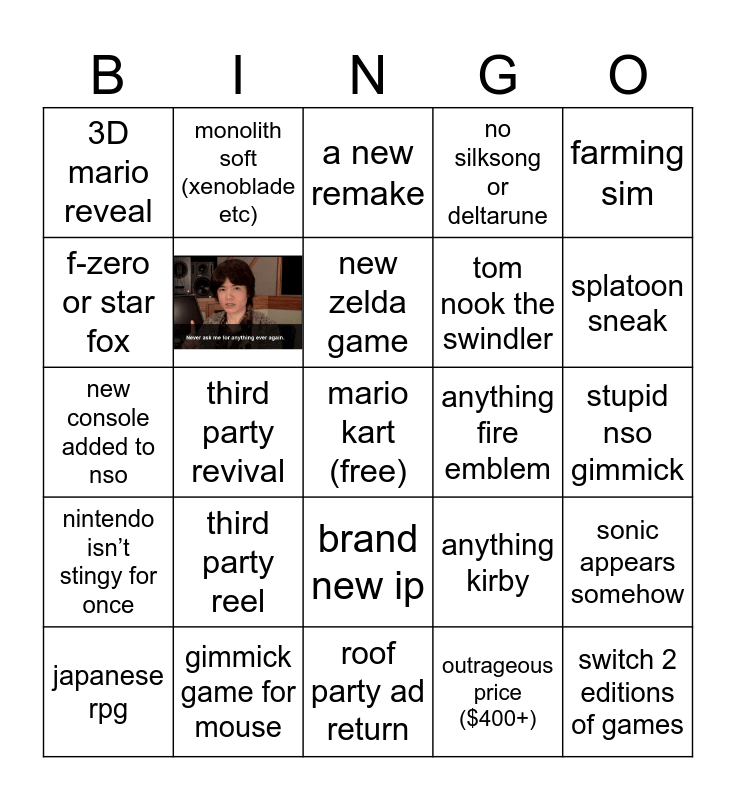 This bingo card has 1 images, a free space and 23 words: third party reel, gimmick game for mouse, new zelda game, japanese rpg, farming sim, 3D mario reveal, f-zero or star fox, monolith soft (xenoblade etc), anything fire emblem, brand new ip, tom nook the swindler, new console added to nso, anything kirby, sonic appears somehow, outrageous price ($400+), stupid nso gimmick, a new remake, splatoon sneak, third party revival, switch 2 editions of games, nintendo isn’t stingy for once, no silksong or deltarune and roof party ad return.