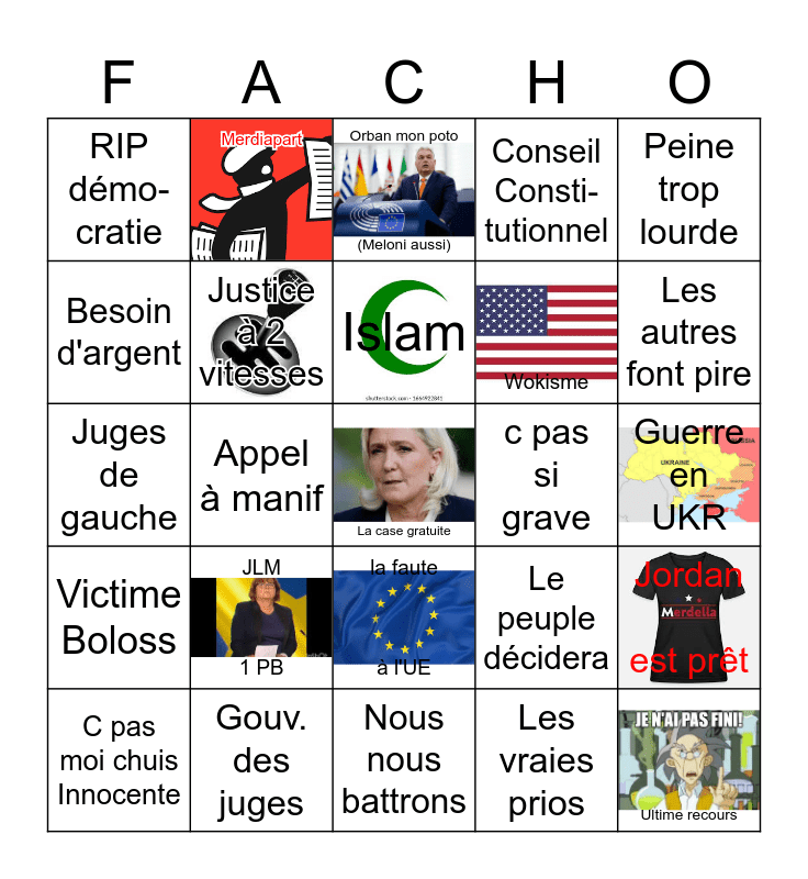 This bingo card has 10 images, a free space and 24 words: JLM 1 PB, Gouv. des juges, Islam, C pas moi chuis Innocente, Peine trop lourde, RIP démo-cratie, Besoin d'argent, Merdiapart, c pas si grave, la faute à l'UE, Wokisme, Juges de gauche, Le peuple décidera, Jordan est prêt, Justice à 2 vitesses, Les vraies prios, Guerre en UKR, Orban mon poto (Meloni aussi), Les autres font pire, Appel à manif, Ultime recours, Victime Boloss, Conseil Consti-tutionnel and Nous nous battrons.