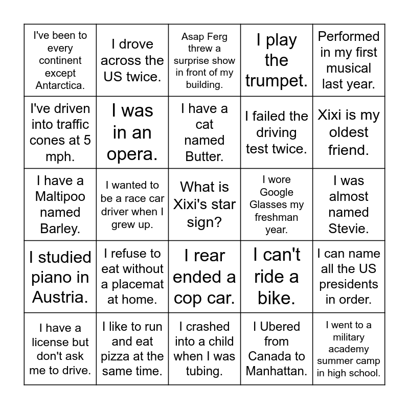 This bingo card has a free space and 24 words: I refuse to eat without a placemat at home., I like to run and eat pizza at the same time., I have a cat named Butter., I have a license but don't ask me to drive., Performed in my first musical last year., I've been to every continent except Antarctica., I've driven into traffic cones at 5 mph., I drove across the US twice., I wore Google Glasses my freshman year., I rear ended a cop car., I failed the driving test twice., I have a Maltipoo named Barley., I can't ride a bike., I can name all the US presidents in order., I was in an opera., I Ubered from Canada to Manhattan., I was almost named Stevie., Asap Ferg threw a surprise show in front of my building., Xixi is my oldest friend., I wanted to be a race car driver when I grew up., I went to a military academy summer camp in high school., I studied piano in Austria., I play the trumpet. and I crashed into a child when I was tubing..
