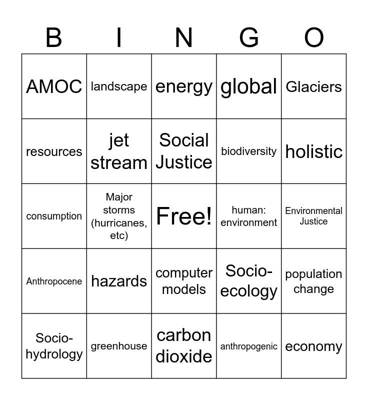 This bingo card has a free space and 26 words: computer models, anthropogenic, Social Justice, greenhouse, Glaciers, AMOC, resources, landscape, Environmental Justice, Socio-ecology, biodiversity, consumption, population change, Socio-hydrology, Major storms (hurricanes, etc), earth system (science), global, Anthropocene, energy, economy, holistic, carbon dioxide, human: environment, hazards, jet stream and ocean currents.