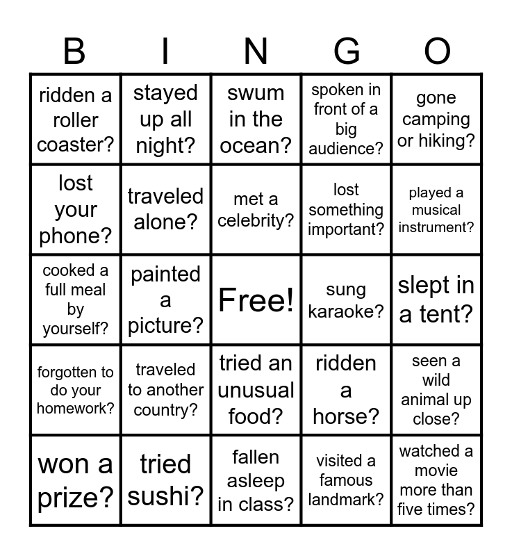 This bingo card has a free space and 24 words: traveled to another country?, tried sushi?, met a celebrity?, won a prize?, gone camping or hiking?, ridden a roller coaster?, lost your phone?, stayed up all night?, sung karaoke?, tried an unusual food?, lost something important?, cooked a full meal by yourself?, ridden a horse?, seen a wild animal up close?, traveled alone?, visited a famous landmark?, slept in a tent?, swum in the ocean?, played a musical instrument?, painted a picture?, watched a movie more than five times?, forgotten to do your homework?, spoken in front of a big audience? and fallen asleep in class?.