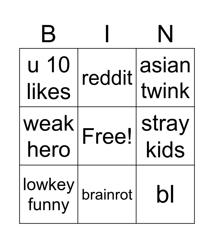 This bingo card has a free space and 8 words: stray kids, asian twink, reddit, lowkey funny, u 10 likes, bl, weak hero and brainrot.