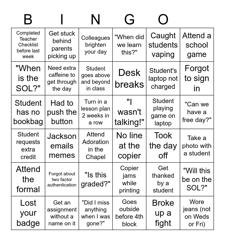 This bingo card has 36 words: Student requests extra credit, Jackson emails memes, "Did I miss anything when I was gone?", Desk breaks, Student playing game on laptop, "Can we have a free day?", Completed Teacher Checklist before last week, Get an assignment without a name on it, Colleagues brighten your day, Copier jams while printing, Student's laptop not charged, Attend a school game, Attend the formal, Had to push the button, Student goes above and beyond in class, "When did we learn this?", Get thanked by a student, Take a photo with a student, "When is the SOL?", Need extra caffeine to get through the day, Attend Adoration in the Chapel, No line at the copier, Took the day off, "Will this be on the SOL?", Student has no bookbag, Get stuck behind parents picking up, Turn in a lesson plan 2 weeks in a row, Goes outside before 4th block, Caught students vaping, Forgot to sign in, Lost your badge, Forgot about two factor authentication, "Is this graded?", "I wasn't talking!", Broke up a fight and Wore jeans (not on Weds or Fri).