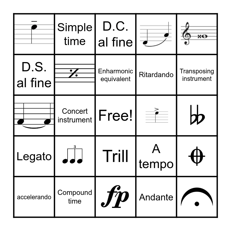 This bingo card has 11 images, a free space and 13 words: Compound time, Enharmonic equivalent, accelerando, D.S. al fine, Simple time, Trill, Ritardando, A tempo, Andante, D.C. al fine, Transposing instrument, Concert instrument and Legato.