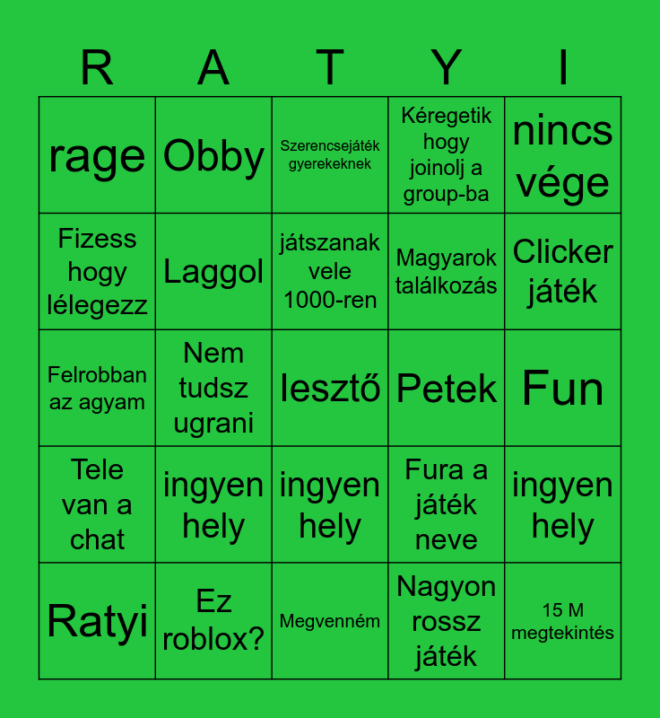 This bingo card has a free space and 24 words: ingyen hely, Ez roblox?, játszanak vele 1000-ren, Ratyi, nincs vége, rage, Fizess hogy lélegezz, Obby, Petek, ingyen hely, Magyarok találkozás, Felrobban az agyam, Fura a játék neve, ingyen hely, Laggol, Nagyon rossz játék, Fun, Szerencsejáték gyerekeknek, Clicker játék, Nem tudsz ugrani, 15 M megtekintés, Tele van a chat, Kéregetik hogy joinolj a group-ba and Megvenném.