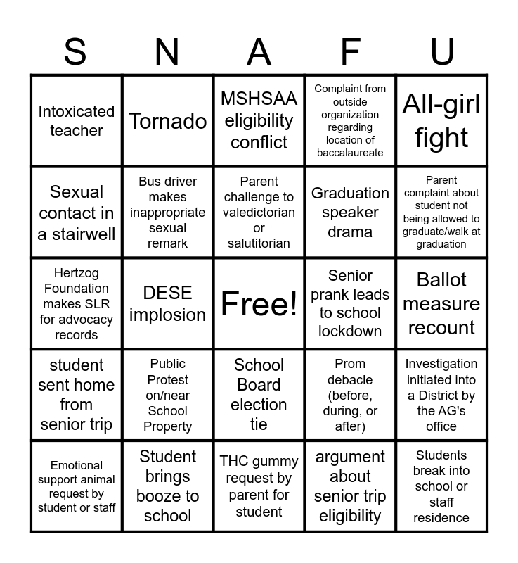 This bingo card has a free space and 24 words: Public Protest on/near School Property, Student brings booze to school, Parent challenge to valedictorian or salutitorian, Emotional support animal request by student or staff, All-girl fight, Intoxicated teacher, Sexual contact in a stairwell, Tornado, Senior prank leads to school lockdown, School Board election tie, Graduation speaker drama, Hertzog Foundation makes SLR for advocacy records, Prom debacle (before, during, or after), Investigation initiated into a District by the AG's office, Bus driver makes inappropriate sexual remark, argument about senior trip eligibility, Ballot measure recount, MSHSAA eligibility conflict, Parent complaint about student not being allowed to graduate/walk at graduation, DESE implosion, Students break into school or staff residence, student sent home from senior trip, Complaint from outside organization regarding location of baccalaureate and THC gummy request by parent for student.