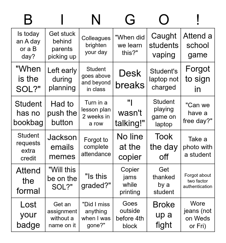 This bingo card has 36 words: Student requests extra credit, Jackson emails memes, "Did I miss anything when I was gone?", Desk breaks, Student playing game on laptop, "Can we have a free day?", Is today an A day or a B day?, Get an assignment without a name on it, Colleagues brighten your day, Copier jams while printing, Student's laptop not charged, Attend a school game, Attend the formal, Had to push the button, Student goes above and beyond in class, "When did we learn this?", Get thanked by a student, Take a photo with a student, "When is the SOL?", Left early during planning, Forgot to complete attendance, No line at the copier, Took the day off, Forgot about two factor authentication, Student has no bookbag, Get stuck behind parents picking up, Turn in a lesson plan 2 weeks in a row, Goes outside before 4th block, Caught students vaping, Forgot to sign in, Lost your badge, "Will this be on the SOL?", "Is this graded?", "I wasn't talking!", Broke up a fight and Wore jeans (not on Weds or Fri).