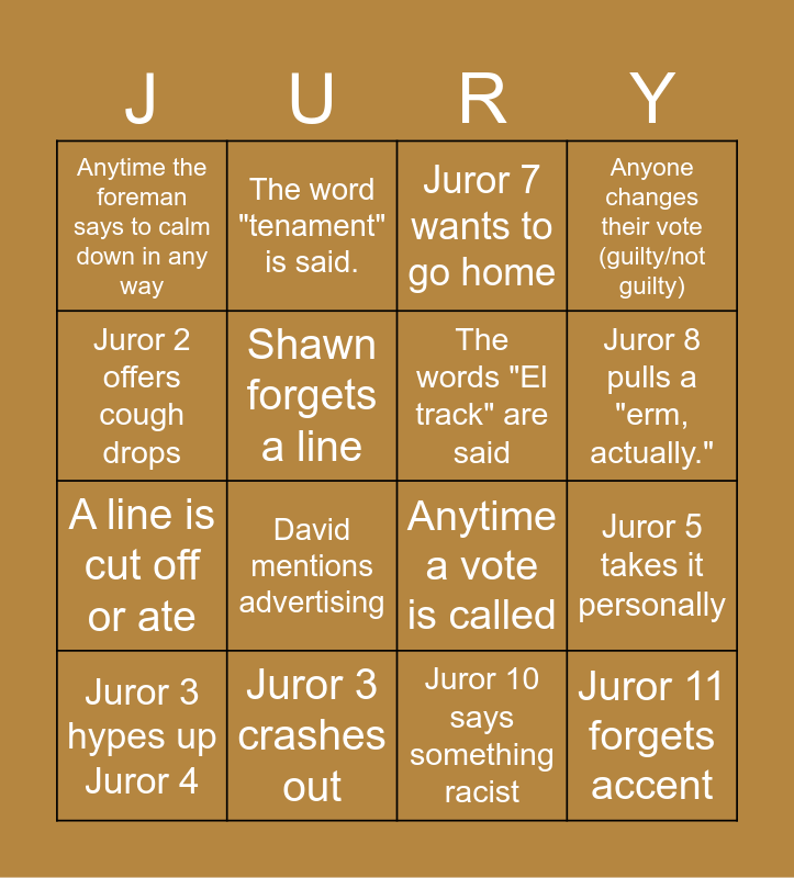 This bingo card has 16 words: Juror 3 crashes out, Juror 5 takes it personally, Juror 7 wants to go home, Anytime the foreman says to calm down in any way, A line is cut off or ate, The word "tenament" is said., Anytime a vote is called, Juror 10 says something racist, Juror 2 offers cough drops, Shawn forgets a line, Juror 3 hypes up Juror 4, Anyone changes their vote (guilty/not guilty), David mentions advertising, Juror 8 pulls a "erm, actually.", The words "El track" are said and Juror 11 forgets accent.