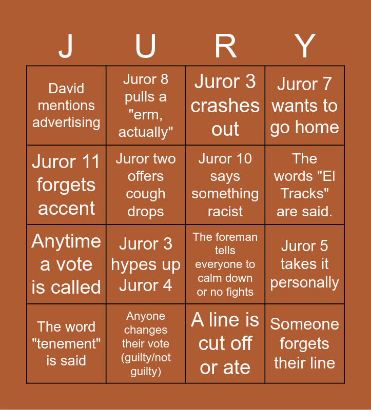 This bingo card has 16 words: The word "tenement" is said, Anyone changes their vote (guilty/not guilty), Juror 3 crashes out, Juror 7 wants to go home, Juror 11 forgets accent, Juror 8 pulls a "erm, actually", The foreman tells everyone to calm down or no fights, Juror 5 takes it personally, David mentions advertising, Juror two offers cough drops, A line is cut off or ate, The words "El Tracks" are said., Anytime a vote is called, Juror 3 hypes up Juror 4, Juror 10 says something racist and Someone forgets their line.