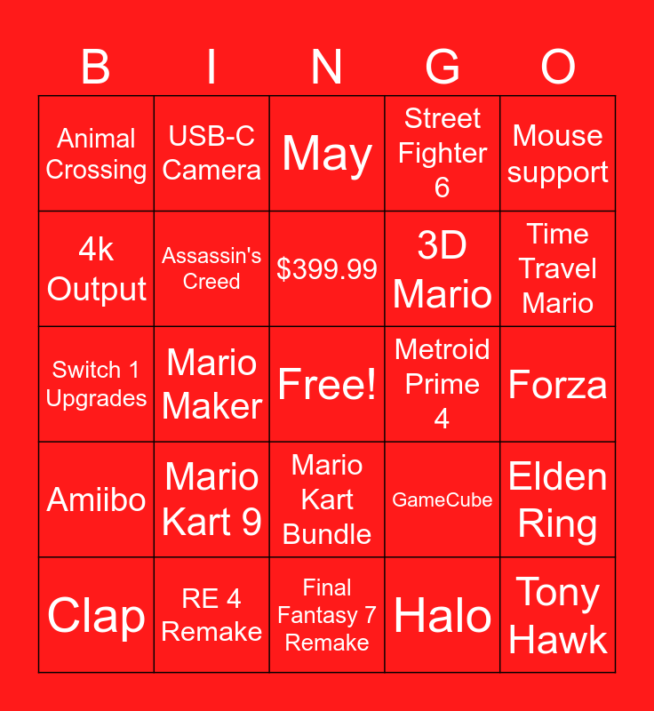 This bingo card has a free space and 24 words: Mario Kart 9, RE 4 Remake, $399.99, Clap, Mouse support, Animal Crossing, 4k Output, USB-C Camera, Metroid Prime 4, Mario Kart Bundle, 3D Mario, Switch 1 Upgrades, GameCube, Elden Ring, Assassin's Creed, Halo, Forza, May, Time Travel Mario, Mario Maker, Tony Hawk, Amiibo, Street Fighter 6 and Final Fantasy 7 Remake.