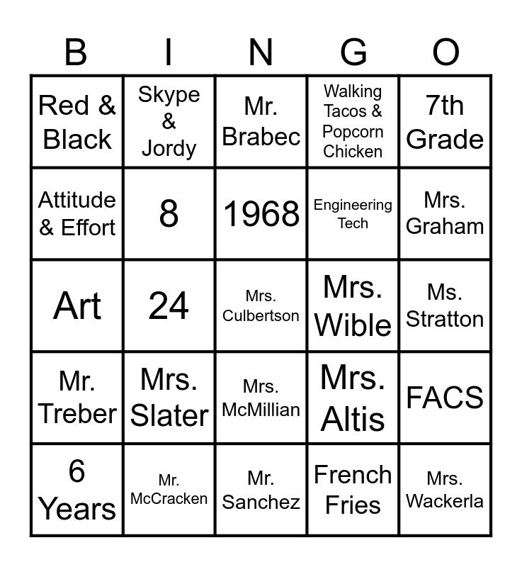 This bingo card has 25 words: Mrs. Slater, Mr. Sanchez, 1968, 6 Years, 7th Grade, Red & Black, Attitude & Effort, Skype & Jordy, Mrs. Wible, Mrs. McMillian, Engineering Tech, Art, Mrs. Altis, FACS, 8, Mrs. Wackerla, Ms. Stratton, Mr. Brabec, Mrs. Graham, 24, Mrs. Culbertson, Mr. McCracken, Mr. Treber, Walking Tacos & Popcorn Chicken and French Fries.