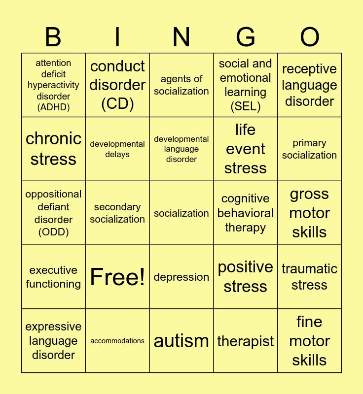 This bingo card has 25 words: Free!, autism, developmental language disorder, expressive language disorder, receptive language disorder, attention deficit hyperactivity disorder (ADHD), chronic stress, conduct disorder (CD), cognitive behavioral therapy, depression, life event stress, oppositional defiant disorder (ODD), positive stress, traumatic stress, developmental delays, fine motor skills, gross motor skills, agents of socialization, primary socialization, secondary socialization, socialization, accommodations, executive functioning, social and emotional learning (SEL) and therapist.
