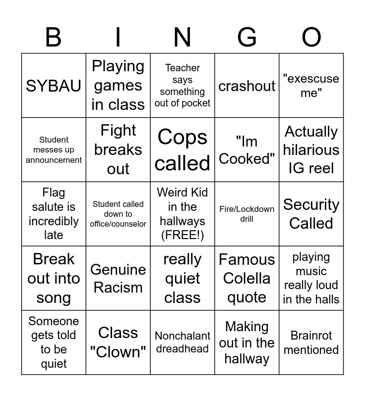This bingo card has a free space and 29 words: Class isn't assigned homework, Class "Clown", Teacher says something out of pocket, Teacher is absent, "exescuse me", SYBAU, Fight breaks out, Cops called, Fire/Lockdown drill, playing music really loud in the halls, Someone gets told to be quiet, Student called down to office/counselor, Making out in the hallway, Brainrot mentioned, Flag salute is incredibly late, Smoking in the bathroom, Nonchalant dreadhead, Famous Colella quote, Actually hilarious IG reel, Break out into song, Genuine Racism, Cringe, "Im Cooked", Security Called, Student messes up announcement, Playing games in class, really quiet class, crashout and just an asshole.