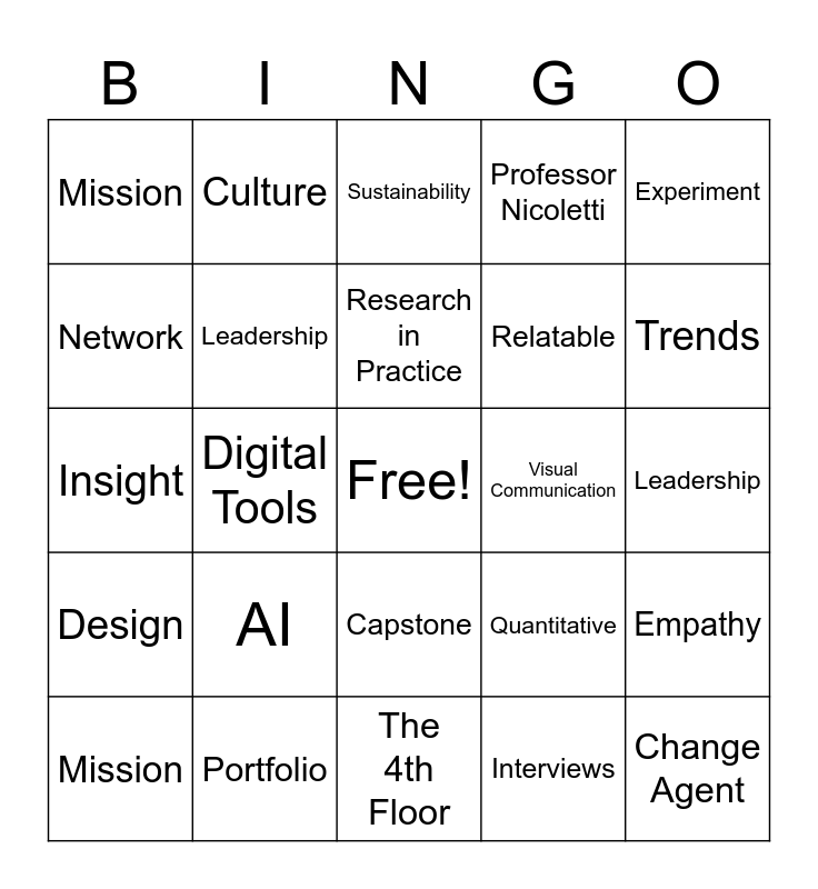 This bingo card has a free space and 228 words: AI, Analog, Capstone, Change Agent, ChatGPT, Community, Concept, Context, Ctrl + Z Saves Lives, Culture, Data, Data Analysis, Deadline, Design, Design Issues, Design Research, Design Thinking, Digital Tools, Did We Have Homework?, Dr. Emily, Dr. Fathers, Dr. J, Dr. Kowalski, Draw, Empathy, Environment, Equity and Inclusion, Ethics, Experiment, Feedback, Fieldwork, Focus Group, Free Pizza, Framework, Future, Goals, Good Vibes, Google Scholar, Graphs and Charts, Group Project, Group Project Panic, I Love Wood, Illustrator, Implications, Innovation, Insight, Inquiry, Interdisciplinary, Internship, Interviews, IRB, It’s in the Syllabus, LA Abroad, Leadership, Literature Review, Mentor, Methodology, Mission, Model, My Dog Ate My Homework, Network, Observation, Peer Review, Peer-Reviewed, PechaKucha, Portfolio, Presentation, Problem, Professionalism, Professor Earle, Professor Heckman, Professor Nicoletti, Project Management, Protocol, Purpose, Qualitative, Quantitative, Ready for Summer, Reflection, Relatable, Rendering, Research, Research in Practice, Research Proposal, Running on 2 Hours of Sleep, Smith Hall, Social Impact, Social Justice, Social Norms, SOURCE Funding, Stakeholders, Statistics, Storytelling, Strategy, Studio, Study Abroad, Sustainability, Synthesis, Syracuse, The 4th Floor, The Warehouse, Theory, Think Tank, Trends, Transparency, Umbrella Topics, User, Value, Visualization, Visual Communication, Wicked Problem, Zoom, Ctrl + Z Saves Lives, Google Scholar, Running on 2 Hours of Sleep, Problem, Mentor, Draw, Community, Framework, Presentation, Zoom, Graphs and Charts, IRB, Visual Communication, SOURCE Funding, Design Issues, Innovation, Design Research, Design Thinking, My Dog Ate My Homework, Design, Future, Professor Nicoletti, Quantitative, Professor Earle, Reflection, Digital Tools, Sustainability, Portfolio, Professor Heckman, Think Tank, Transparency, Mission, Research, Umbrella Topics, Insight, I Love Wood, LA Abroad, Ready for Summer, Analog, Dr. J, It’s in the Syllabus, Professionalism, Statistics, Change Agent, Visual Communication, Google Scholar, Experiment, Syracuse, Empathy, AI, Dr. Fathers, Internship, Research Proposal, Relatable, Culture, Fieldwork, Data Analysis, Model, Good Vibes, Project Management, Dr. Emily, Stakeholders, Social Impact, Creative Thinking, Observation, Interdisciplinary, PechaKucha, Capstone, Theory, Network, Equity and Inclusion, Deadline, Social Norms, Innovation, Free Pizza, Goals, Creative Problem Solving, Storytelling, Rendering, User, Professor Earle, Research in Practice, Leadership, Transparency, Portfolio, Quantitative, Wicked Problem, Design, Ethics, Professor Nicoletti, Data, Presentation, Value, Research, Visualization, Design Thinking, Inquiry, Visual Communication, Mission, Literature Review, Dr. Kowalski, Focus Group, Social Justice, Studio, Insight, Concept, Smith Hall, Environment, Strategy, Did We Have Homework?, Change Agent, Ctrl + Z Saves Lives, Group Project Panic, Group Project, The Warehouse and The 4th Floor.