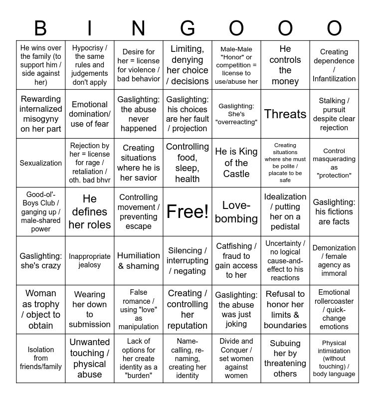 This bingo card has a free space and 48 words: Gaslighting: the abuse was just joking, Threats, Name-calling, re-naming, creating her identity, He defines her roles, Creating situations where he is her savior, Gaslighting: his fictions are facts, Hypocrisy / the same rules and judgements don't apply, Unwanted touching / physical abuse, He controls the money, Silencing / interrupting / negating, Creating dependence / Infantilization, Limiting, denying her choice / decisions, Creating situations where she must be polite / placate to be safe, He is King of the Castle, Woman as trophy / object to obtain, Idealization / putting her on a pedistal, Rewarding internalized misogyny on her part, Stalking / pursuit despite clear rejection, Refusal to honor her limits & boundaries, Male-Male "Honor" or competition = license to use/abuse her, Gaslighting: She's "overreacting", Controlling movement / preventing escape, He wins over the family (to support him / side against her), Emotional domination/ use of fear, Emotional rollercoaster / quick-change emotions, Gaslighting: the abuse never happened, Control masquerading as "protection", Isolation from friends/family, Controlling food, sleep, health, Rejection by her = license for rage / retaliation / oth. bad bhvr, Subuing her by threatening others, Love-bombing, Demonization / female agency as immoral, Wearing her down to submission, Good-ol'-Boys Club / ganging up / male-shared power, Catfishing / fraud to gain access to her, Uncertainty / no logical cause-and-effect to his reactions, Sexualization, Humiliation & shaming, False romance / using "love" as manipulation, Gaslighting: she's crazy, Physical intimidation (without touching) / body language, Desire for her = license for violence / bad behavior, Lack of options for her create identity as a "burden", Gaslighting: his choices are her fault / projection, Creating / controlling her reputation, Inappropriate jealosy and Divide and Conquer / set women against women.