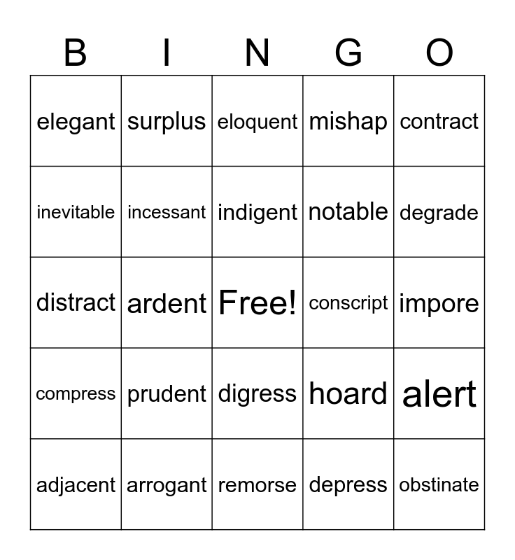 This bingo card has a free space and 29 words: adjacent, apparent, ardent, consistent, elegant, eloquent, incessant, prudent, conscript, arrogant, impore, obstinate, remorse, depress, degrade, detract, digress, compress, contract, distract, hoard, cache, notable, inevitable, mishap, surplus, alert, indigent and boastful.
