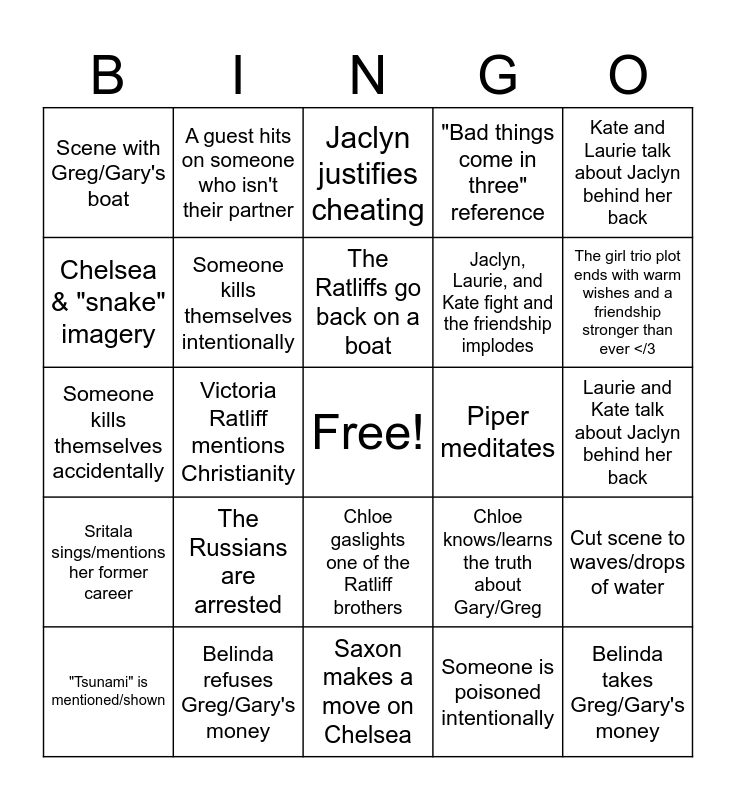 This bingo card has a free space and 63 words: Incest returns (ie: the Ratliffs), Chelsea brings up Astrology, One of the Ratliff's dream a bad omen, Cut scene to waves/drops of water, Thai folk music plays, Chloe gaslights Saxon, A guest hits on someone who isn't their partner, Jaclyn/Laurie/Kate mention their age/youth, The Ratliffs go back on a boat, Gary/Greg and Belinda have a confrontation, Chloe gaslights one of the Ratliff brothers, Jaclyn and Laurie talk about Kate behind her back, Laurie and Kate talk about Jaclyn behind her back, Kate and Laurie talk about Jaclyn behind her back, Timothy Ratliff mentions Christianity, Chelsea & "snake" imagery, Victoria Ratliff mentions Christianity, Scene with Greg/Gary's boat, Saxon makes a pervy remark about women, Jaclyn, Laurie, and Kate fight and the friendship implodes, The Russians are arrested, Sritala sings/mentions her former career, "Bad things come in three" reference, Someone verbally says "Duke" or "Chapel Hill", Timothy wears a Duke shirt, Gaitok flirts with Mook, Timothy fights for his phone, Dave (Kate's husband) comes up in the girl trio fight, Mook manipulates Gaitok, Lochy wears a graphic tshirt, Belinda sees a lizard, Zion makes fun of his mama ;), Chelsea and Chloe hang out by the pool, Chelsea and Chloe have a falling out, The girl trio plot ends with warm wishes and a friendship stronger than ever </3, "Tsunami" is mentioned/shown, Belinda has another spa montage/is shown working at the spa, Someone is poisoned intentionally, Someone is poisoned accidentally, Someone kills themselves intentionally, Someone kills themselves accidentally, Piper meditates, Piper does yoga, Saxon confronts Lochy about the handjob, Belinda takes Greg/Gary's money, Belinda refuses Greg/Gary's money, The characters eat fruit for breakfast, Chloe knows/learns the truth about Gary/Greg, Timothy pops a pill, Piper abandons Buddhism and/or cancels her plans to join the monestary, Monkey scene, Saxon makes a move on Chelsea, Sam Rockwell returns, Girl trio gets robbed by the Russians, Saxon makes a pervy remark about women, Jaclyn justifies cheating, Kate grows a spine and picks a side, Shot of a corpse in a body bag, Pornchai flirts with Belinda, Greg/Gary preys on Zion, One of the hotel guests stays in Thailand indefinitely, Saxon turns on the blender (again) and Tanya is mentioned.