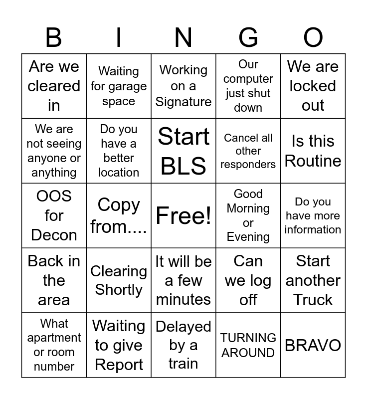 This bingo card has a free space and 43 words: CODE BLUE, BRAVO, We are here but have no truck, What apartment or room number, Are you aware of our crew change, TURNING AROUND, Working on a Signature, Waved in by PD, We are locked out, Waiting to give Report, Our computer just shut down, Good Morning or Evening, It will be a few minutes, Clearing Shortly, Start Fire/Rescue, Delayed by a train, Treating a diabetic, OOS for Decon, Stuck in Triage, Is this Routine, Waiting for garage space, Is this code 3, We need 610/510, Are we cleared in, Still Getting Narcs, Do you have more information, We are having stretcher issues, CODE 4, Can we log off, Back in the area, Delayed on the floor, Start another Truck, Are we closer, Copy from...., In the area, Is Fire Responding, Our notes say we are canceled, Start BLS, We are not seeing anyone or anything, Cancel all other responders, We need PD, Do you have a better location and Code 3 to the hospital.