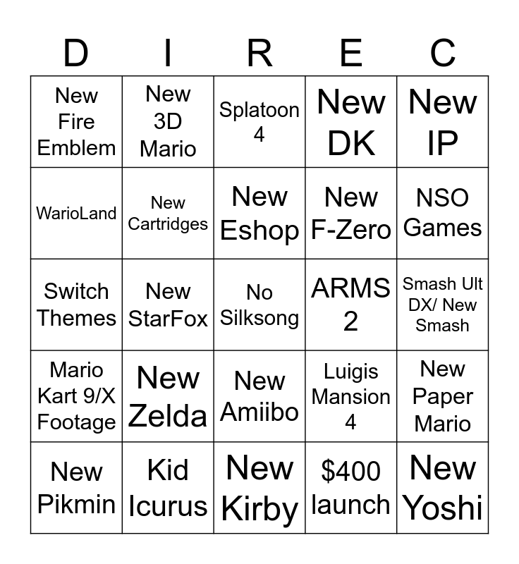 This bingo card has a free space and 24 words: New Zelda, Kid Icurus, New Eshop, New Pikmin, New IP, New Fire Emblem, WarioLand, New 3D Mario, ARMS 2, New Amiibo, New F-Zero, Switch Themes, Luigis Mansion 4, New Paper Mario, New Cartridges, $400 launch, Smash Ult DX/ New Smash, Splatoon 4, NSO Games, New StarFox, New Yoshi, Mario Kart 9/X Footage, New DK and New Kirby.